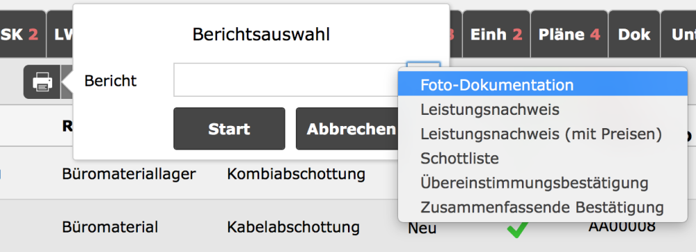 Diese Variante wird für die Ausgabe von Übereinstimmungsbestätigungen oder Fachunternehmer-Erklärungen benutzt. Die Ausgabe erfolgt über die Detailseite der Abschottungen.