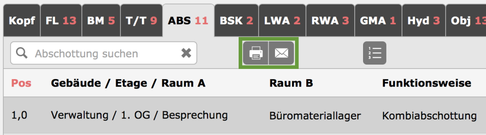 Die Ausgabe von Abschottungen in Form einer Liste erfolgt über entsprechende Symbole in der Liste der Abschottungen im Reiter “ABS” des Arbeitsauftrages.