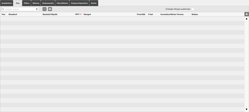 In der Liste kann nach “Pos”, “Standort”, “Bauteil/Objekt”, “Mangel”, “Priorität”, “Frist”, “Verantwortliche Person” und “Status” sortiert werden. Um bestimmte Einträge zu finden, tragen Sie den gesuchten Mangel in das Suchfeld oben Links im Layout ein. Das Suchfeld durchsucht alle in der Liste angezeigten Felder nach dem Suchbegriff oder einem Teil des Suchbegriffs.