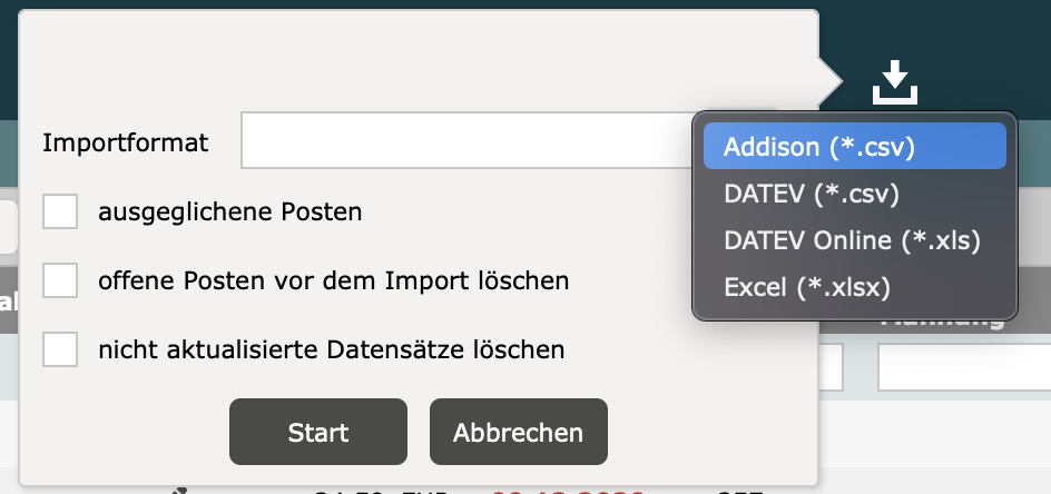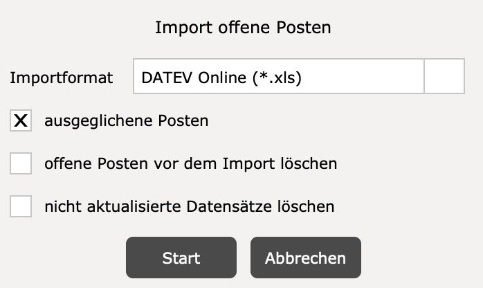 Wenn keine weitere Option gesetzt ist, werden bezahlte Rechnungen nicht ausgetragen (Ein Ausgleich erfolgt sonst nur, wenn im Format DATEV Unternehmen Online ausgeglichene Posten importiert werden). Es muss aus diesem Grund entweder die Option “offene Posten vor dem Import löschen” oder “nicht aktualisierte Datensätze löschen” gesetzt sein.