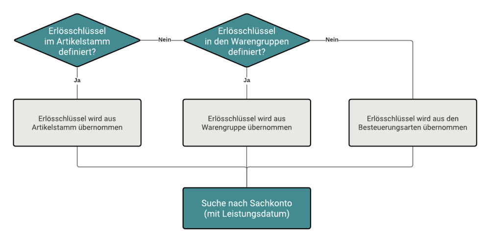 Im ersten Schritt wird der Erlösschlüssel ermittelt. Hier sucht das System primär nach einer Zuordnung im Artikelstamm. Im Artikelstamm kann pro Besteuerungsart ein Erlösschlüssel definiert werden. Sofern im Artikelstamm kein Erlösschlüssel für die aktuelle Besteuerungsart zugeordnet wurde sucht das System im nächsten Schritt nach einem Erlösschlüssel in der Warengruppe. Sollte kein Warengruppenspezifischer Erlösschlüssel definiert sein, nimmt das System die in den Besteuerungsarten definierten Erlösschlüssel. Nachdem das System den Erlösschlüssel ermittelt hat, wird das Sachkonto ermittelt. In den Erlösschlüsseln können in Abhängigkeit vom Leistungszeitraum Sachkonten zugeordnet werden.