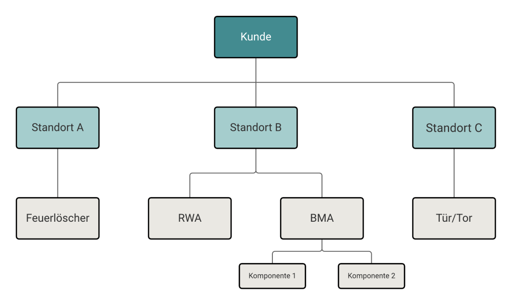 In der obersten Ebene befinden sich die Kunden die einen oder mehrere Standorte haben. Sollen zu einem Kunden Anlagen dokumentiert werden so ist mindestens ein Standort notwendig. Bei umfangreichen Anlagen mit entsprechend großer Stückzahl kann es sinnvoll sein mehrere Standorte anzulegen, obwohl sich diese an einem geographischen Ort befinden. Bei der Neuanlage eines Kunden fragt das System den Benutzer automatisch ob dieser einen Standort anlegen möchte. Wird dieses vom Benutzer bejaht, legt das System einen Standort mit der gleichen Adresse wie die Kundenanschrift an. Sämtliche Vorgänge innerhalb der TIVAPP beginnend vom Arbeitsauftrag über den Verkaufsbeleg bis hin zu Begehungen oder Wartungs- und Serviceverträgen werden immer im Bezug auf einen Kunden und einen Standort erstellt. Innerhalb eines Standortes kann es dann mehrere Anlagen geben. Diese wiederum können aus mehreren Komponenten bestehen. Sofern notwendig können Anlagen von einem Standort in einen anderen verschoben werden. Darüber hinaus ist es auch möglich einen bestehenden Standort einem neuen Kunden zuzuweisen.